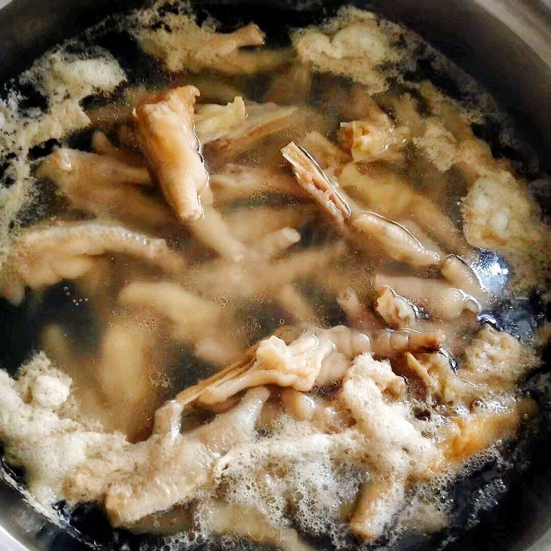 鸡爪冷水下锅,加入姜片和料酒适量焯水,开锅即可出锅,冲洗干净泡沫,晾干水汽。