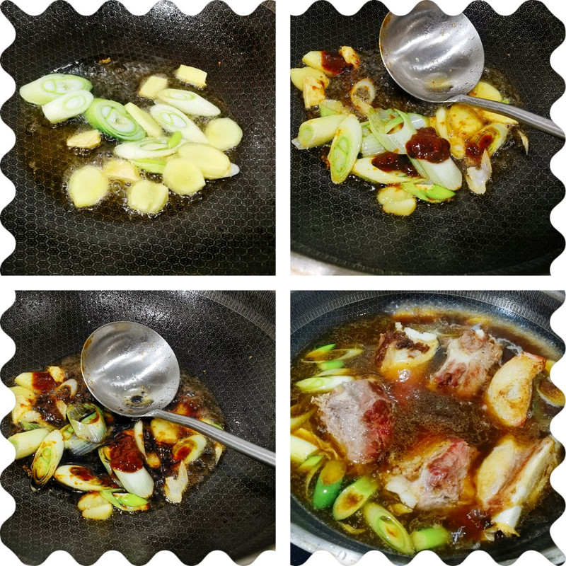 1.直接下入葱姜炒香。2.加入黄豆酱中小火炒香。3.加入生抽酱油炒几下。4.加入适量开水,(必须是开水),加入煎好的牛肋骨。