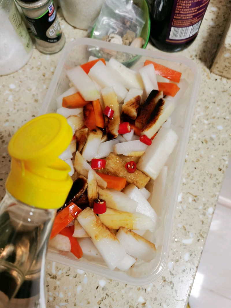 主料:白萝卜1个 胡萝卜1个 白醋1瓶 白糖半斤 盐2勺 小辣椒一根