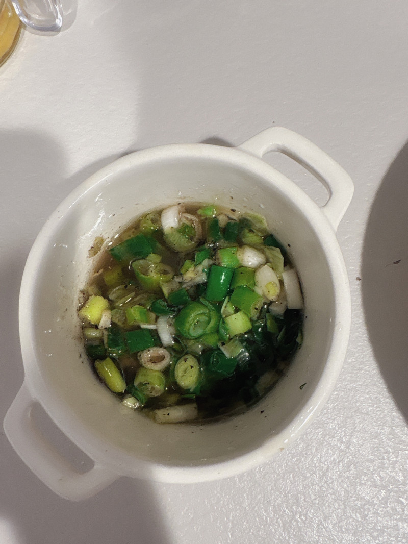 葱切段,放入碗中,放上盐,白胡椒,黑胡椒,生抽,麻油,搅拌均匀。