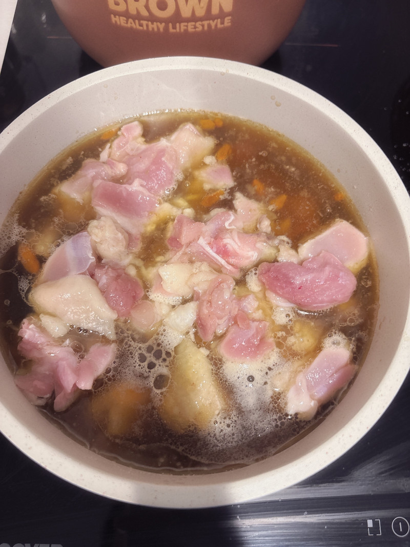 鲜鸡肉切块(一定要最新鲜的,如果不新鲜的话要先用料酒和葱姜水腌制一下)。 起锅烧热水(有鸡高汤最好用鸡高汤),水煮开后下入鸡肉,煮到再次沸腾后再煮5分钟。