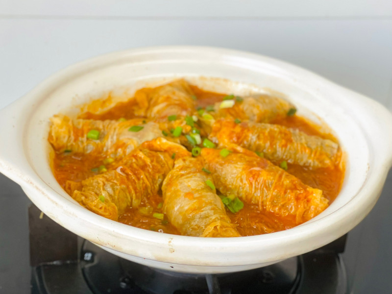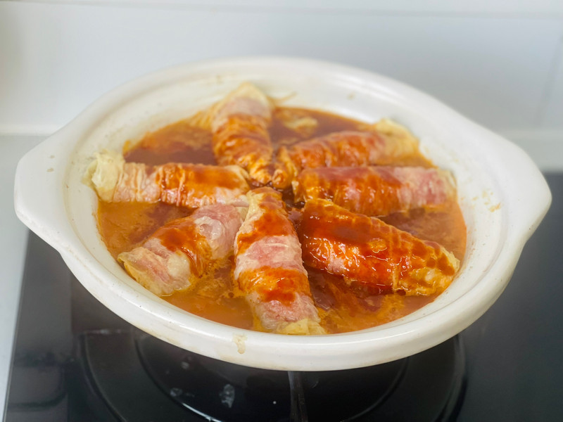 把卷好的肥牛虾滑卷码放在砂锅中,倒入调好的碗汁,盖盖中火炖煮8分钟左右