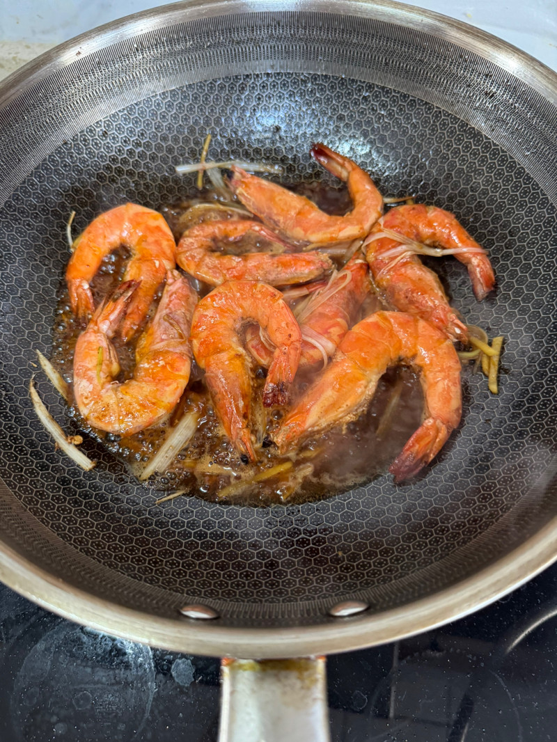 煎至两面变色,虾油煎出来了放姜丝和葱丝,中大火煸炒