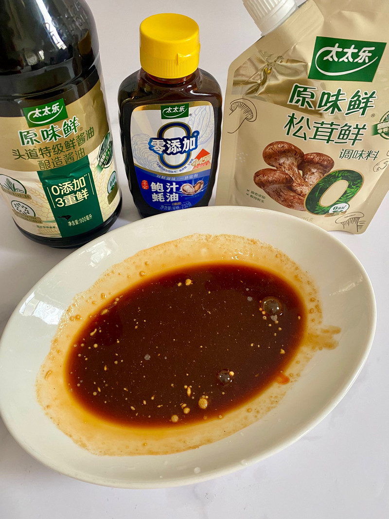 碗中加入太太乐鲍汁蚝油,太太乐原味鲜头道特级鲜酱油,太太乐原味鲜松茸鲜调味料适量盐白糖,白胡椒粉,料酒,麻辣川香汁,适量水搅拌均匀,调成酱汁备用