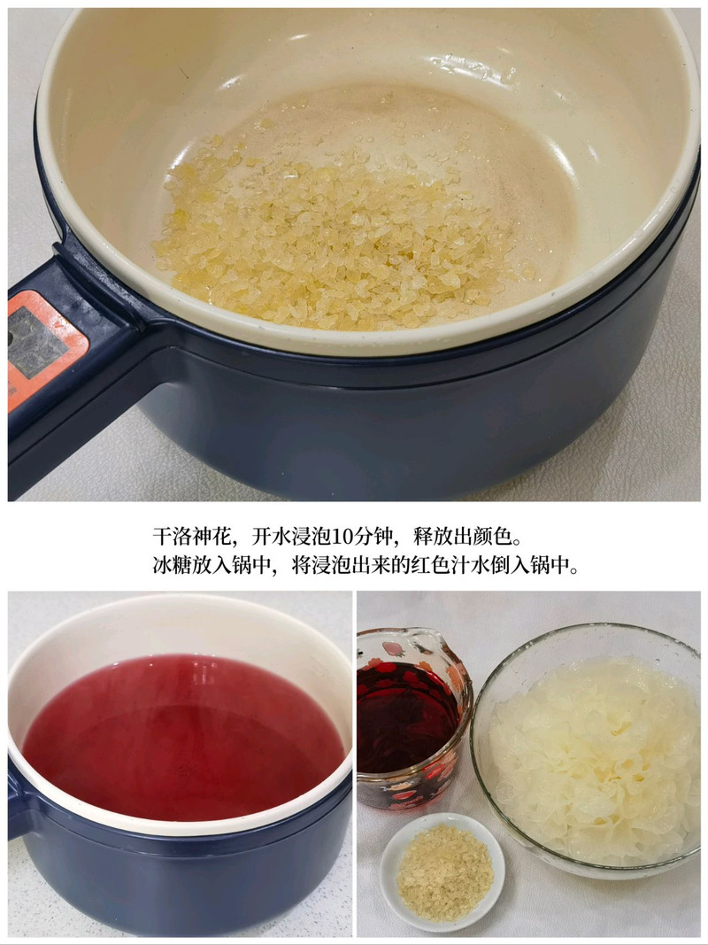 主料:洛神花干5朵 冰糖30克 新鲜银耳1朵 桂花干少许