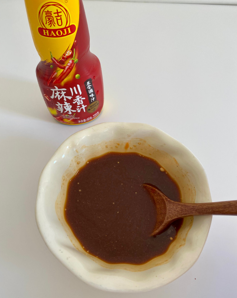 碗中加入一勺豪吉麻辣川香汁,2勺生抽一勺料酒1勺蚝油适量盐白糖白胡椒粉调味,搅拌均匀备用
