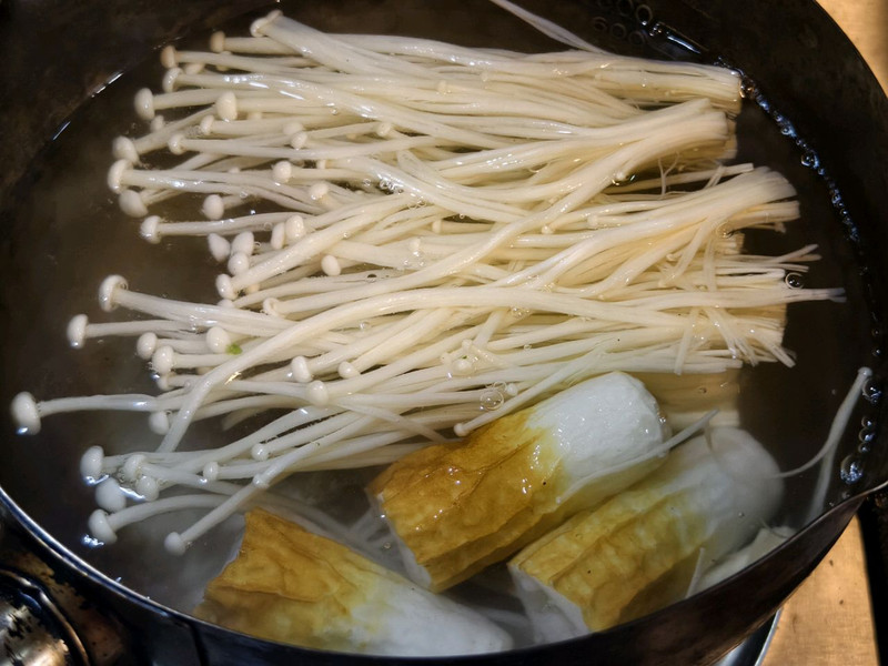魔芋丝、金针菇、鱼竹轮开水烫熟
