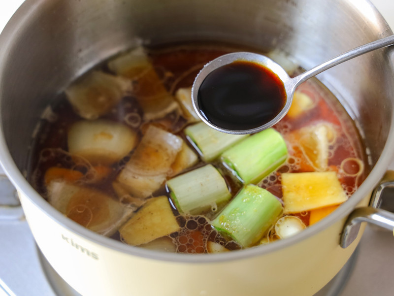 加入3勺生抽+1勺米醋+2勺白糖+1勺鸡精+3克胡椒粉+半碗清水,煮开后转小火炖煮5分钟,葱油汁就做好了