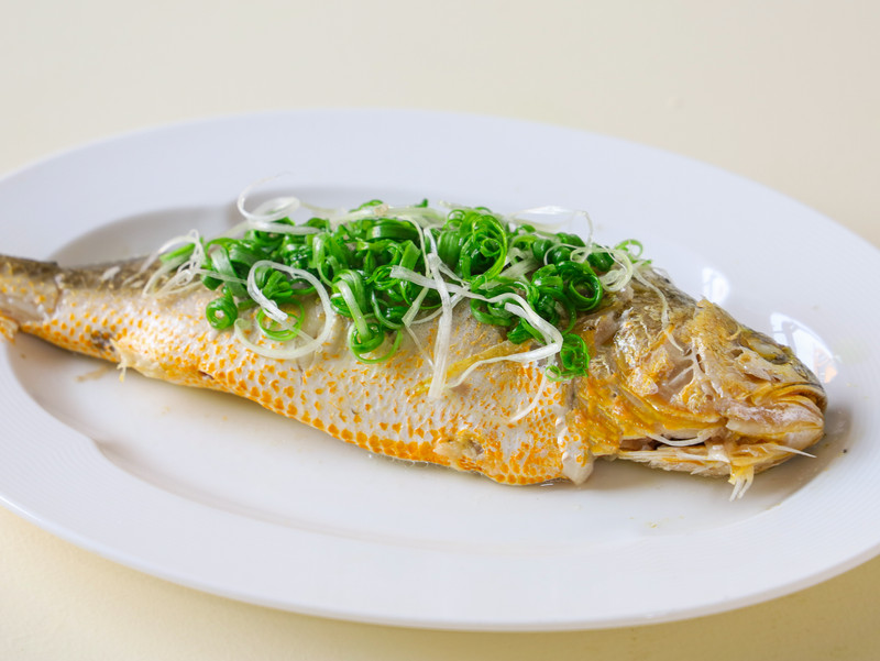 锅内水开,把黄鱼放进去蒸7分钟,倒掉多余的蒸鱼水,放上葱丝