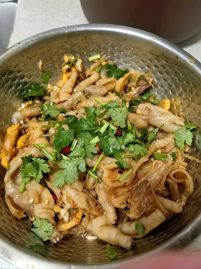 配料:鸡爪16个 姜1小块 小米辣2 香菜2棵 蒜1颗 葱2根 柠檬1个 百香果1个