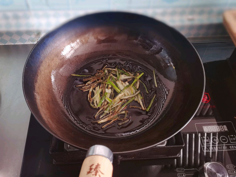 锅加2勺油,放入葱丝,小火炸至葱丝变枯草色,夹出葱丝,锅里只留油