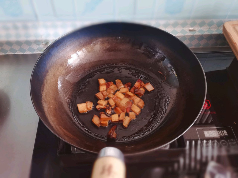 倒入焯烫好的蚕豆仁,中火翻炒2分钟,中途淋入少量浸泡牛肝菌的原水,保持锅内湿润
