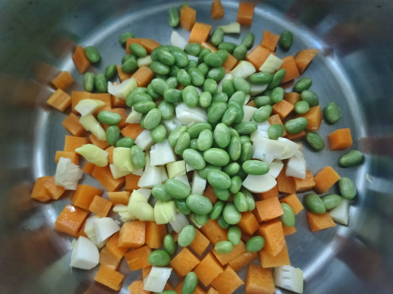 主料:春笋200克 猪肉丁100克 毛豆100克 胡萝卜1根 玉米油20毫升 薄盐黄豆酱2勺 料酒1勺 生抽1/2勺 食盐1克 淀粉少许 清水适量