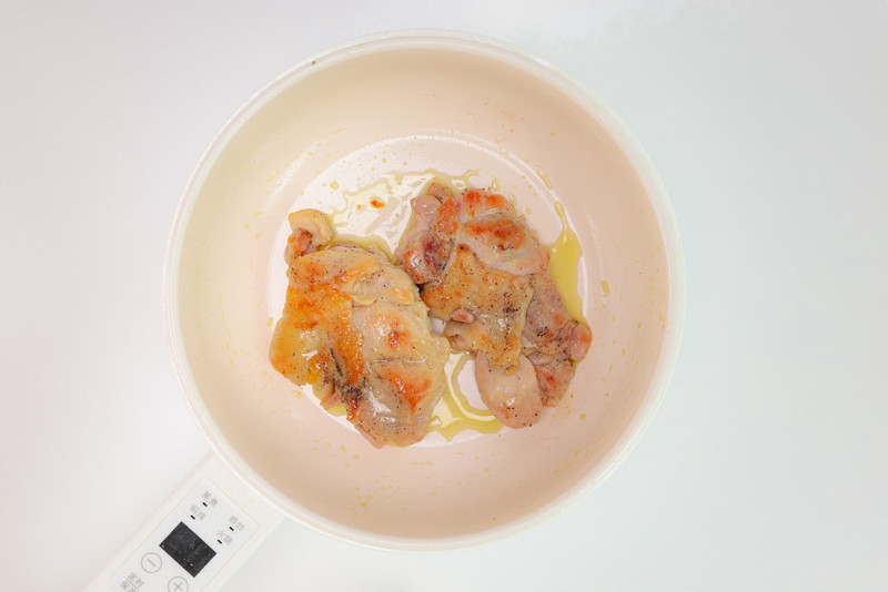 ❸ 煎鸡扒:鸡皮朝下先煎出油脂