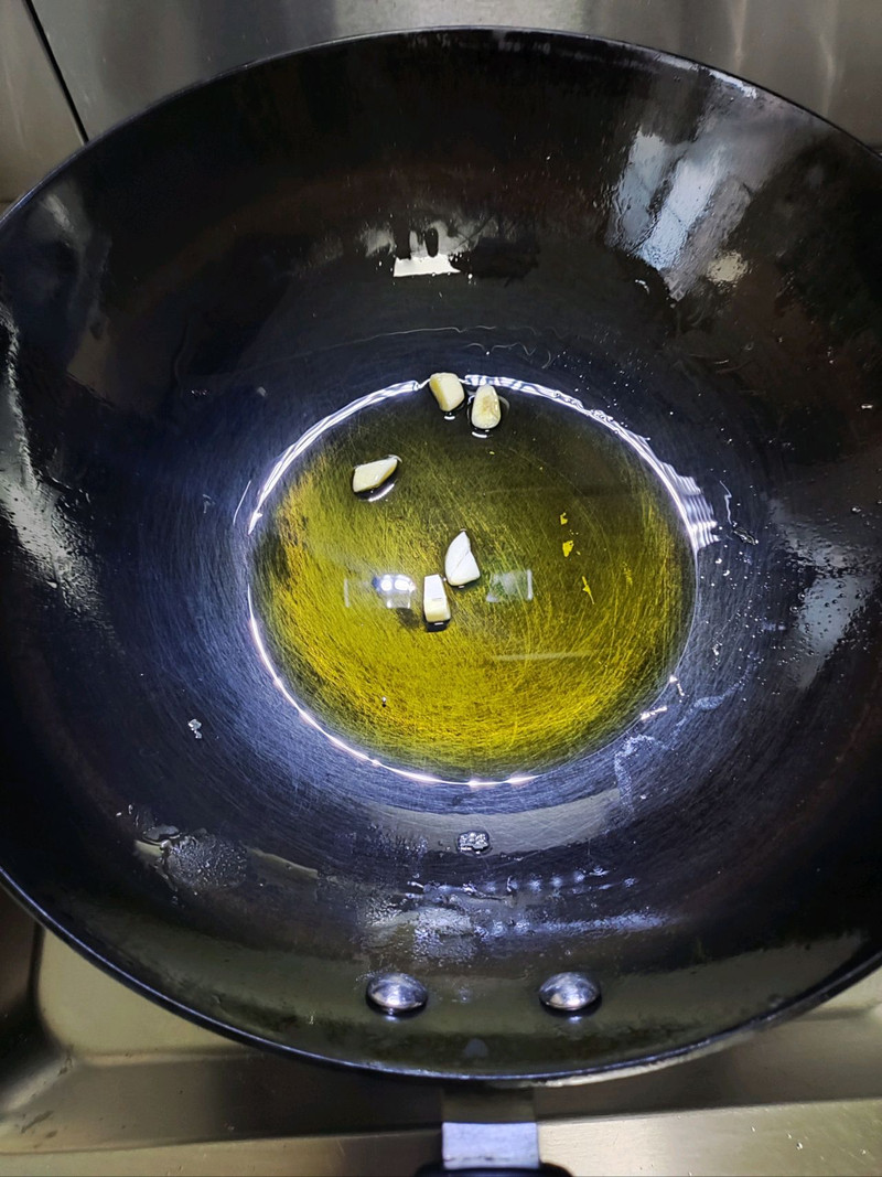 热锅,放一勺菜籽油,放入大蒜,快速煸炒出香味