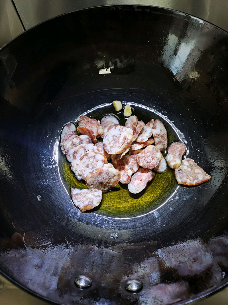主料:蒸熟香肠适量 荷兰豆适量 蚝油鲜露一勺 菜籽油一勺