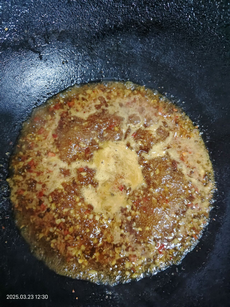 锅内留底油爆香姜、蒜末、辣椒粉,倒入一碗水,烧开后加生抽、蚝油、盐。