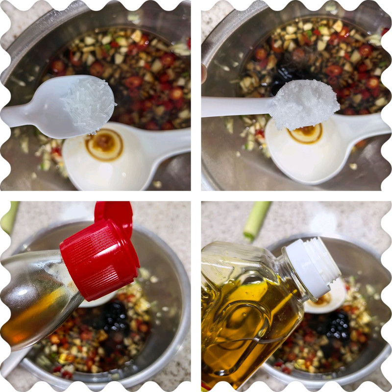 1.全部取出放入碗中。2.准备蒜末姜末小米辣。3.浇30克热油。4.搅拌均匀备用。