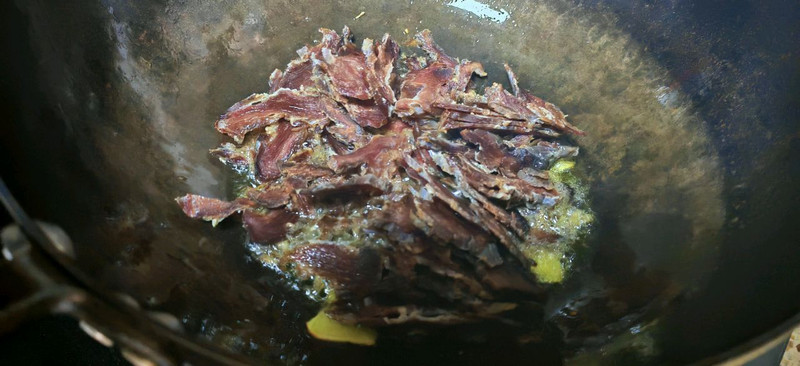 茶油下入生姜片炒香,下入腊牛肉炒出焦色,下入老抽调色,放入原汤煮