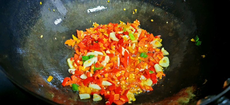 起锅放猪油下入大蒜粒,红线椒,剁辣椒炒出香味,到入煮好的腊牛肉