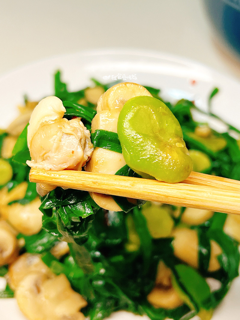 这道菜的关键是用蚕豆和口蘑加水煮出鲜味汤汁,再大火快炒其他食材,使汤汁被充分吸收。