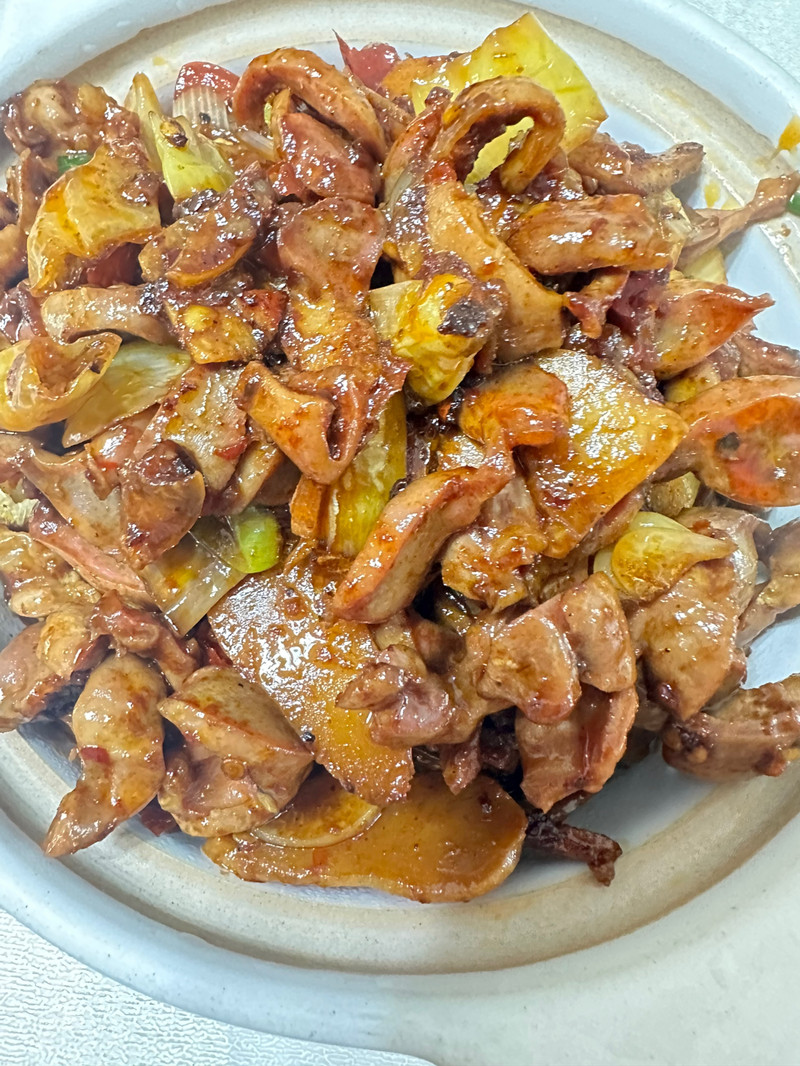 主料:鸡胗10个 生姜1块 油适量 胡椒粉适量 蚝油适量 大蒜苗2根 料酒3勺 小米辣几个 豆瓣酱一勺 火锅底料一小块 生抽一大勺 红泡椒几个(没有可以不放) 味精适量