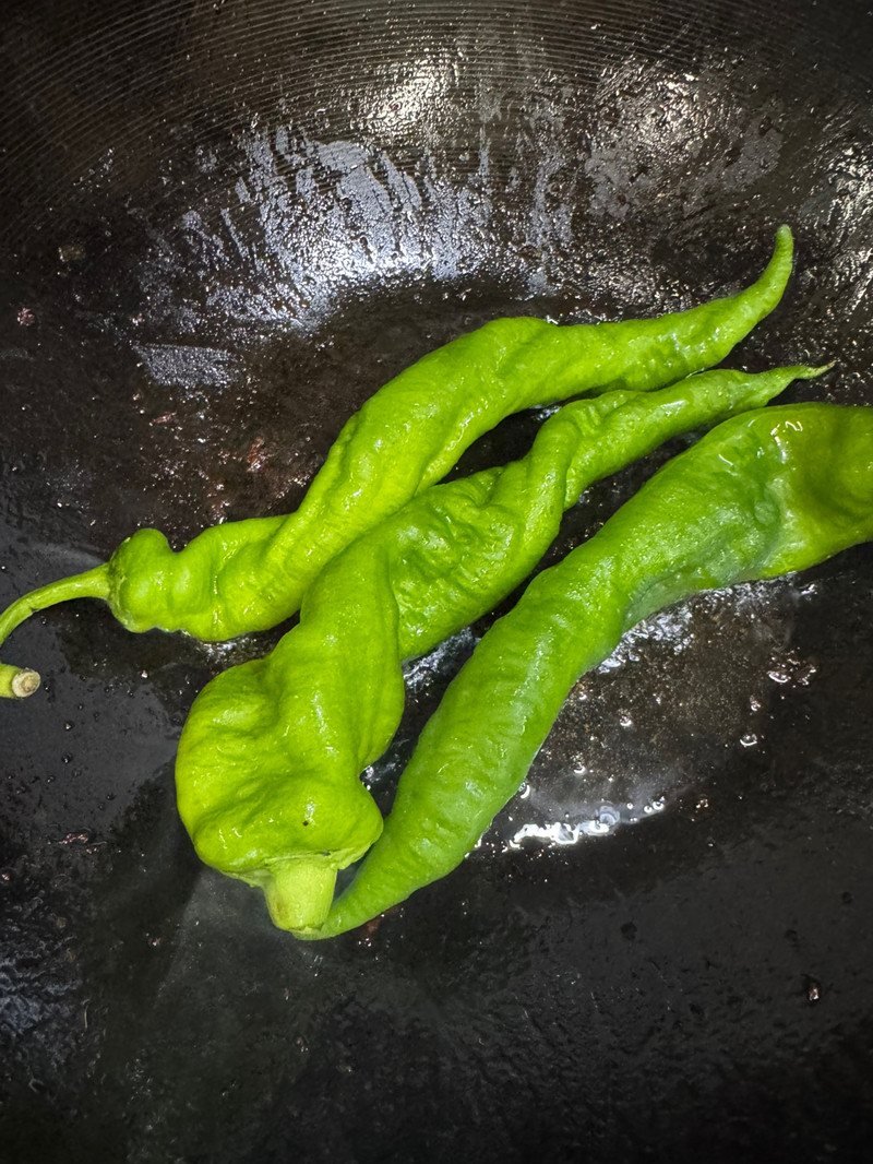 尖椒洗干净之后 用刚才锅里的油 煎至虎皮状 不喜欢吃辣的也可以不用放 也可以煎点鸡蛋 煎好之后就是虎皮鸡蛋啦