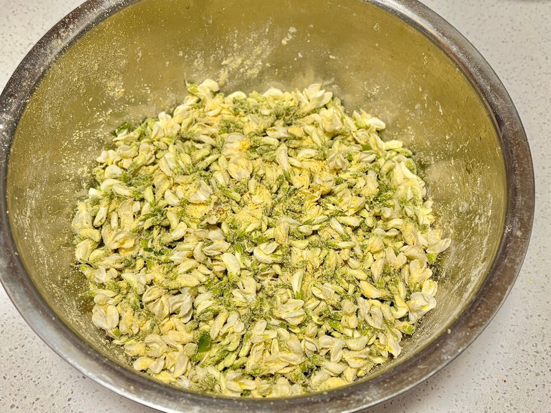 先把槐花喷点油,再把面粉和槐花混合翻拌均匀,加少许盐,十三香