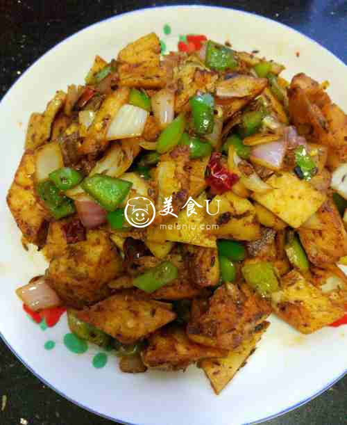 下入青椒丁,洋葱丁煸炒。调入味极鲜,盐,味精翻炒均匀。