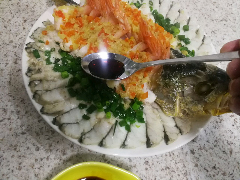 撒上葱花,先浇热油激发出葱香味,最后少量淋入蒸鱼豉油后美食完成。
