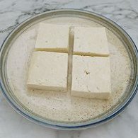 第1步豆腐切厚片,选用老豆腐,煎的时候不容易破碎。淀粉倒入平盘中,把豆腐两面均匀粘上淀粉。