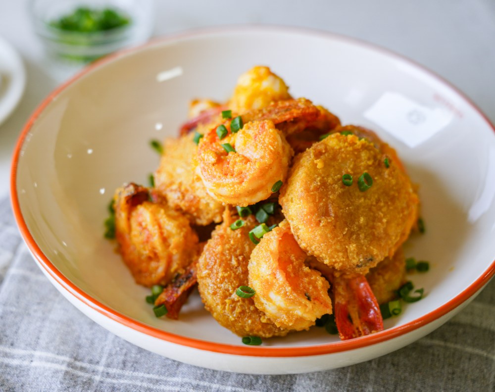 这道菜要用到美国乡村薯饼,美国乡村薯饼由高品质新鲜马铃薯制成,马铃薯是一种营养丰富的蔬菜,提供人体每日所需能量、钾和维生素C。乡村薯饼是圆形的小薯饼,烤完后外脆内绵,薯香四溢。沙沙的咸蛋黄包裹住大虾和薯饼,给薯饼增添了别样的风味和口感。