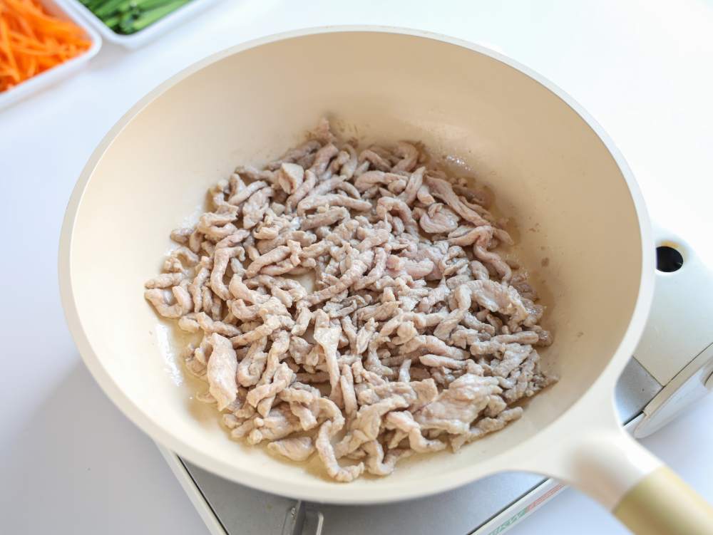 将腌制好的肉丝放入锅中炒至变色即可
