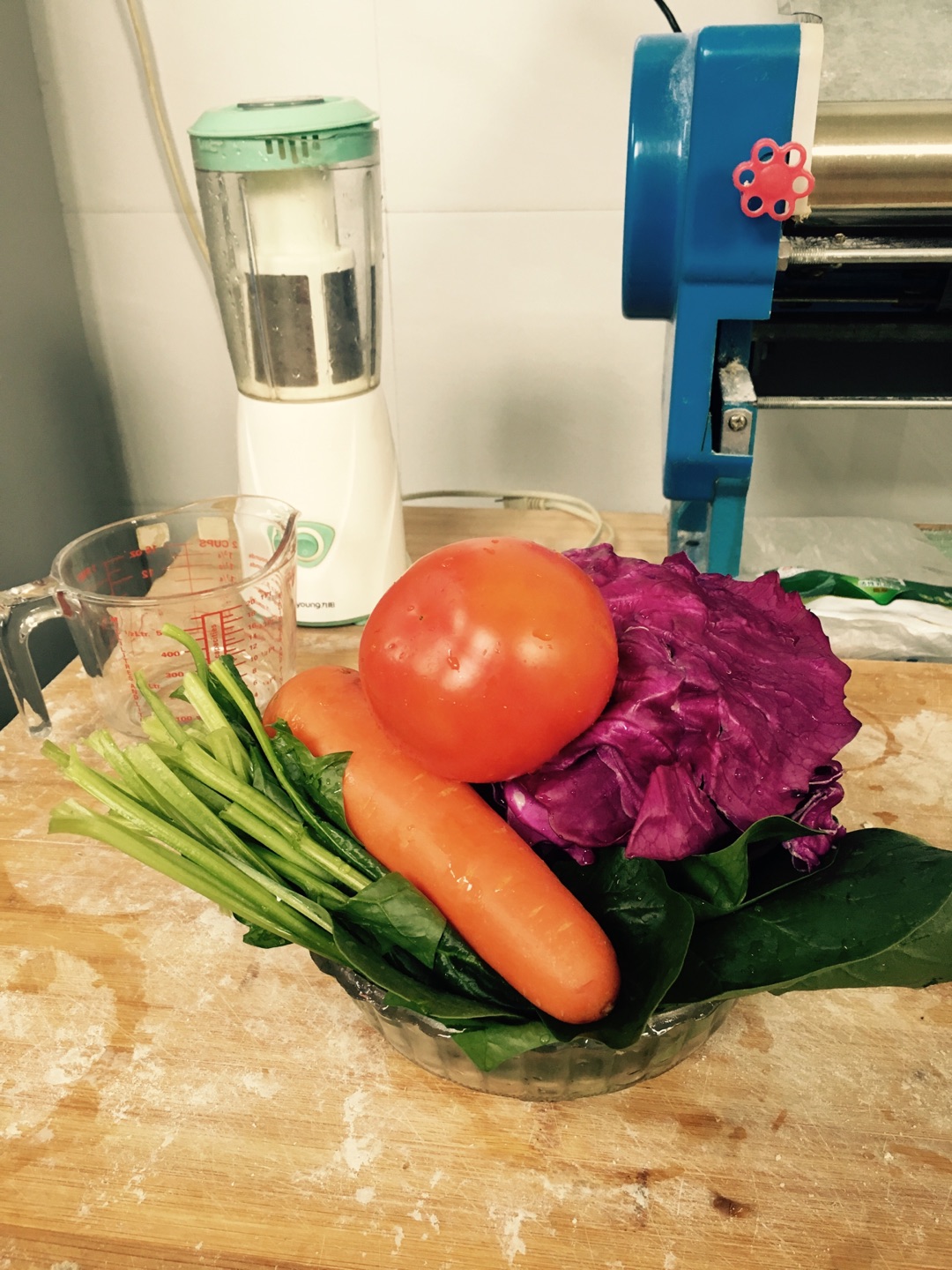 和面 记得放鸡蛋比较筋道 然后依次用四种蔬菜汁和面