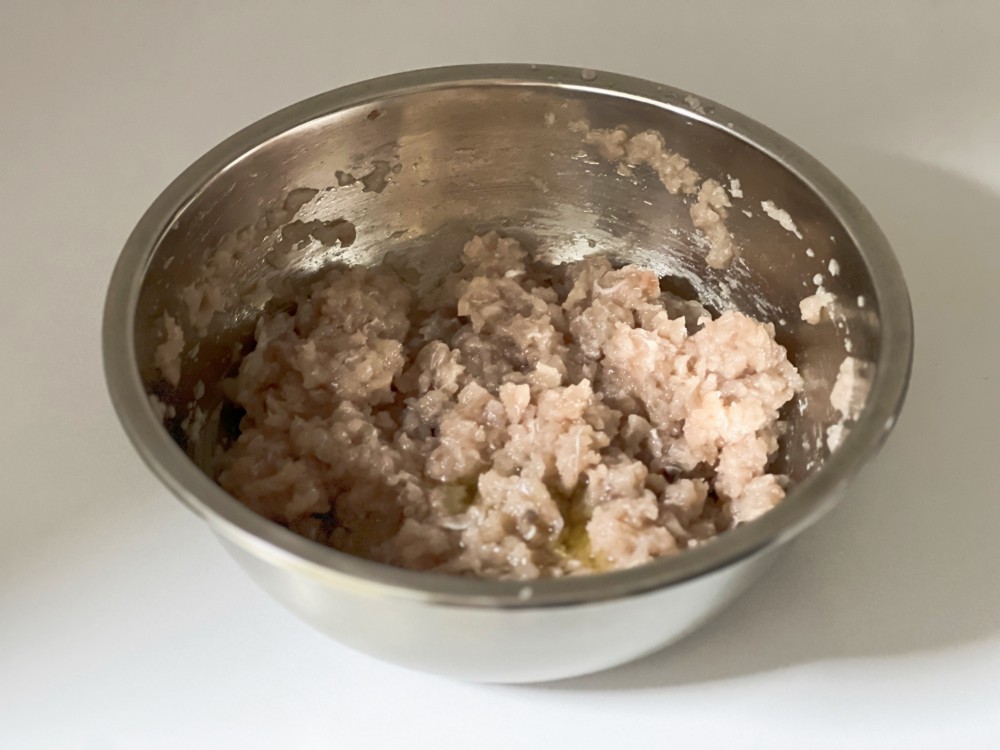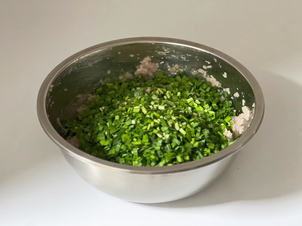 鲅鱼碎中加入韭菜碎,顺时针方向搅匀。