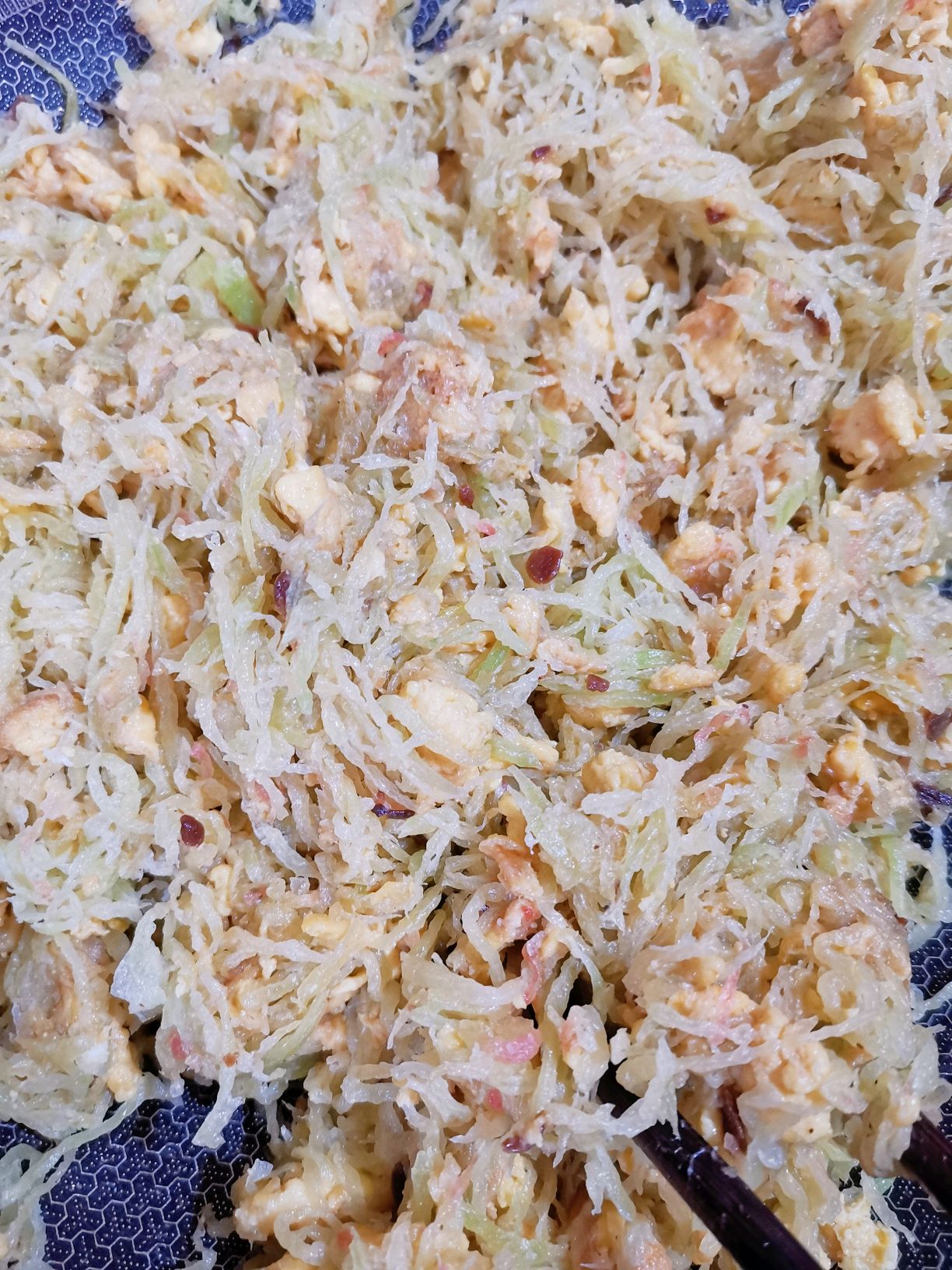 鸡蛋炒熟放凉,加入挤干水的西瓜皮,油,调料(按自己喜欢的口味添加吧),拌均匀