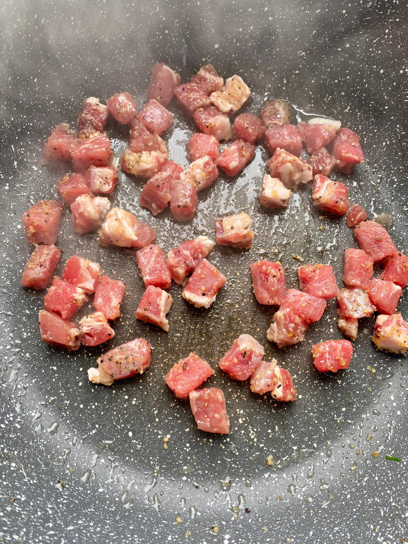 牛排切丁,加入适量牛排调味料调味,拌匀腌制15分钟备用