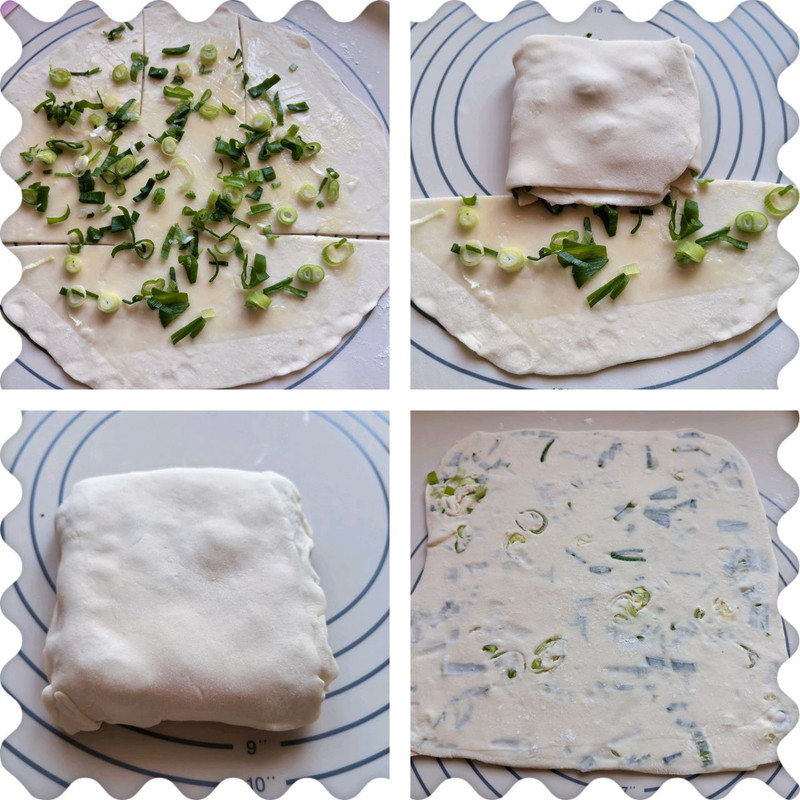 1.按图改一下刀。2.从上到下依次折叠。3.折叠成一个方形的饼胚,边缘用手捏紧。4.用擀面杖再次擀成薄饼。