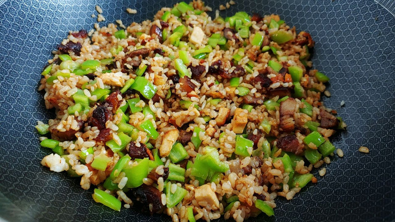 瞅着豆腐肉丁明显上色了根据自己饭量往里铺剩饭