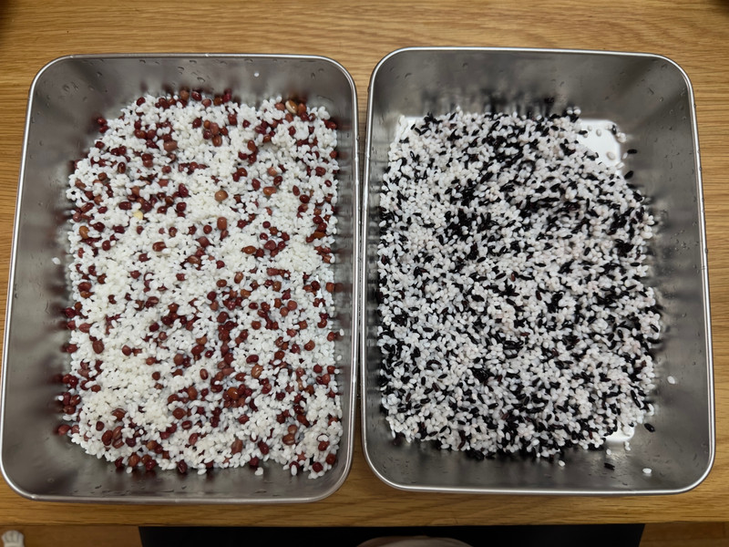 泡好的一半糯米与红豆混合拌匀,一半与黑米混合拌匀