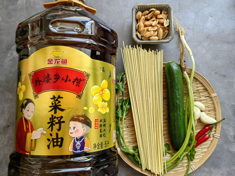 锅中宽水,煮至微开,下去面条煮开后加入一碗凉水,再煮开后再加一碗凉水,再次煮开后沥水捞出(此时面条约八成熟,略带有一丢丢硬芯),拌入金龙鱼外婆乡小榨菜籽油抖散,晾凉备用。