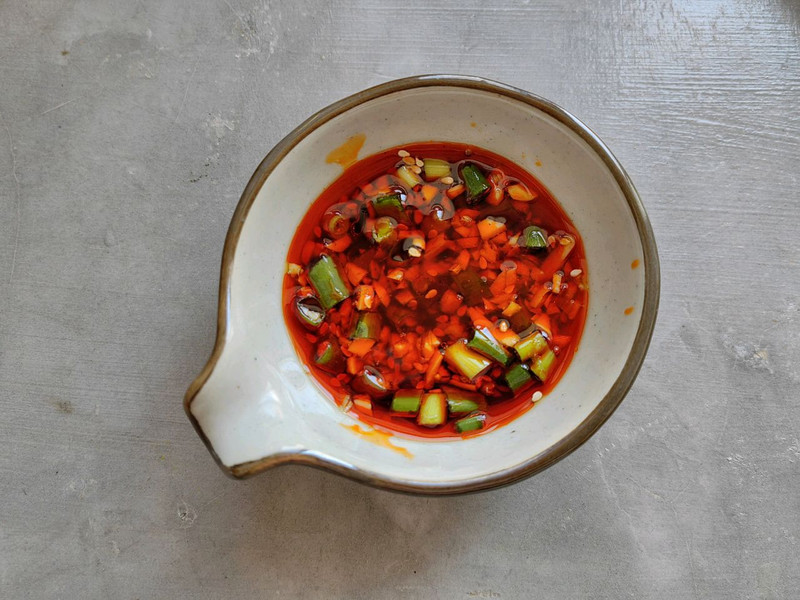 将葱蒜末、盐、味精、辣椒粉、白芝麻加入碗中,淋上烧热的金龙鱼外婆乡小榨菜籽油。再加入2勺味极鲜,2勺醋,1勺蚝油,1小勺白糖,搅拌均匀成料汁。