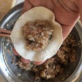 第8步把肉馅儿再顺时针搅拌一下,就可以开始包了。(如果觉得肉馅稍稍有点干,可以加入少量的水进去。)加适量的肉馅儿在皮中央,对折捏紧即可。