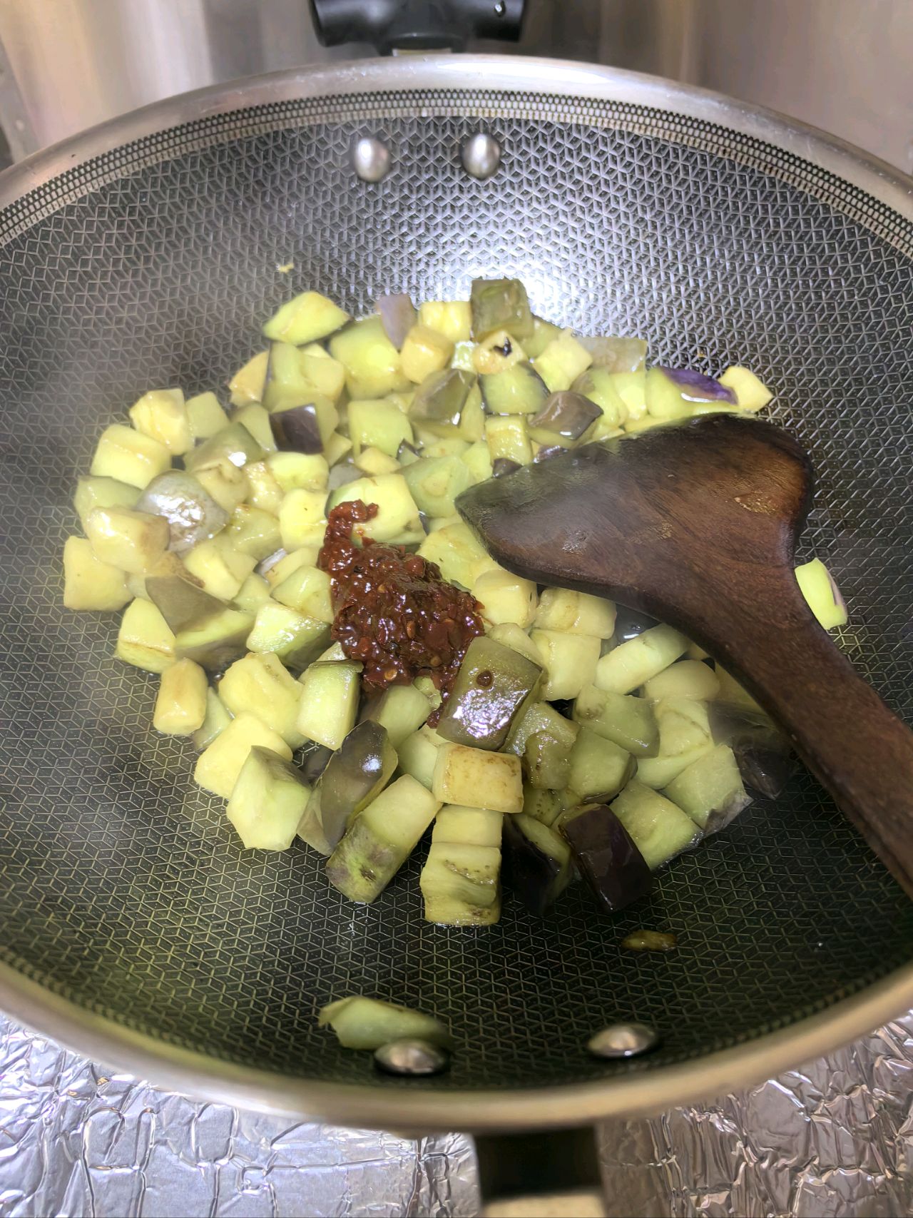 茄子炒到变色后加入辣椒酱,黄豆酱