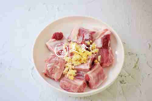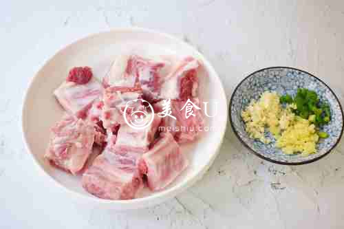 排骨斩成小块加入1汤匙淀粉,用手抓一小会,然后用清水冲洗干净控干水分备用,这个方法比较容易去掉排骨的血水,蒜切末,姜切末,葱切葱花备用