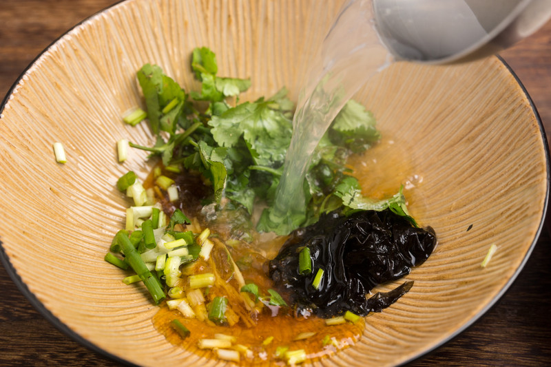 用生抽、香醋、紫菜、葱花、香菜和香油,简单调个底味,倒入沸水。