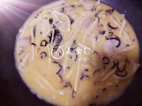 备好食材 将冬笋切丝 黑木耳切丝 五花肉切成薄片 虾仁用淀粉包一层 咸鸭蛋黄压碎