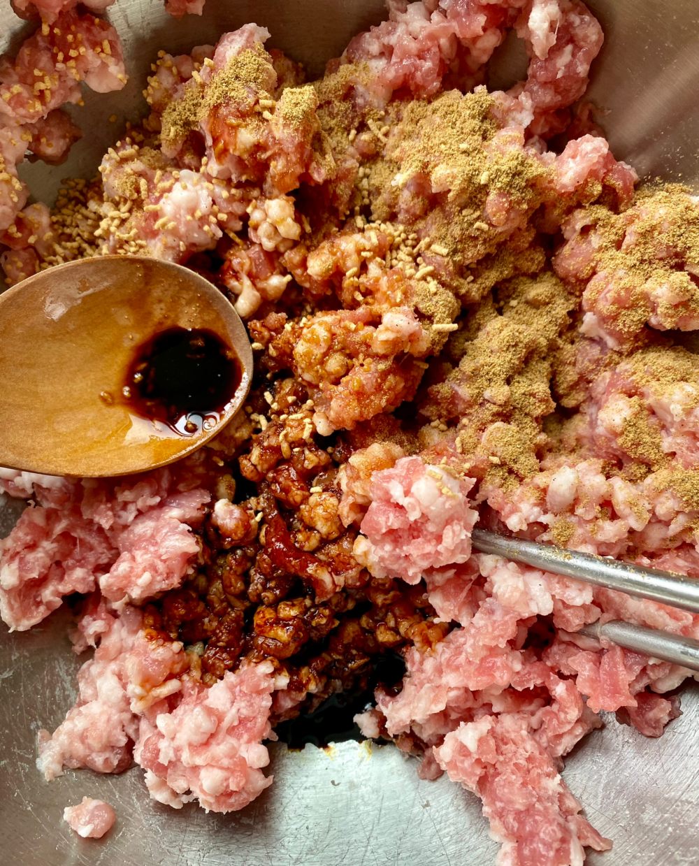 准备肉馅中加入生抽蚝油老抽,盐,鸡精,十三香调味