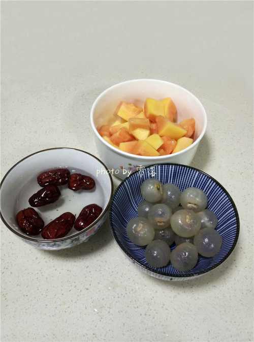 冬天总是特别干燥~~~ 嘴唇需要润唇膏~~~脸蛋需要保湿霜~~~双手需要护手霜~~~ 在大冬天护肤,这些东西缺一不可~~ 记得以前地理课上,老师问我们到底是夏天水分多,还是冬天水分多~~ 然后同学们陆陆续续地说冬天水分多~~ 然后老师抚额~~~表示很无语~~~~ 然后老师不死心地问:“为什么冬天水分多?” 然后,之前回答的同学就说了:“冬天的衣服不容易晾干啊?” 然后,老师继续抚额~~~一点都不想理我们这群笨蛋~~~o(∩_∩)o ~~ 这节课之后,我深深地明白了冬天是如何的干燥~~~如何地缺水~~ 也是以前的化学课~~ 老师说的化学元素周期表,化学工程式等等我都忘光了~~ 只记得居里夫人和甘油~~~ 因为化学老师说,什么护肤品都没有甘油好用~~ 冬天把甘油涂抹在皮肤上,可使皮肤湿润,防止肌肤干裂~~ 嘴唇干裂也可以使用甘油~~效果比唇膏还好哦~~ 再来说说吃货是怎么护肤的吧~~ 吃货要护肤,无疑是打吃的主意~~~ 比如在某时某刻炖盅甜品,细细品味,慢慢吸收~~ 身体从内到外,滋养润燥~~ 木瓜色泽鲜艳,口感鲜美清爽~~营养非常丰富~~~ 木瓜富含胡萝卜素,维生素C~~~抗氧化能力超强~~~可迅速帮助机体修复组织,消除有毒物质,增强人体免疫力~~ 木瓜还含有蛋白分解酵素~~~可以补偿胰和肠道的分泌~~还能分解蛋白质和淀粉~~有减肥功效哦~~ 由此可知,木瓜不仅对女性有美容功效~~还有减肥功能~~ 桂圆有丰富的葡萄糖,蔗糖,蛋白质等~~含铁量也非常高~~~ 可在提高热能,补充营养的同时,促进血红蛋白再生,从而达到补血的效果~~~ 除此之外,桂圆还能增强记忆,消除疲劳~~~ 红枣则有养颜补血的作用~~~常常食用红枣,会令人面色红润~~~ 红枣含有丰富的维生素C,能够促进肌肤细胞的代谢~~防止黑色素沉着~~~ 可使肌肤洁白光滑,达到美白肌肤,祛斑的美容护肤功效~ 红枣还能养血安神,滋补脾胃~~能增强体质,延缓衰老~~ 将木瓜,桂圆,红枣三者炖在一起,既美容养颜,又白皙嫩肤,还能延年益寿~~何乐不为? 闲暇时光,一碗【桂圆木瓜甜品】让你更美丽~~