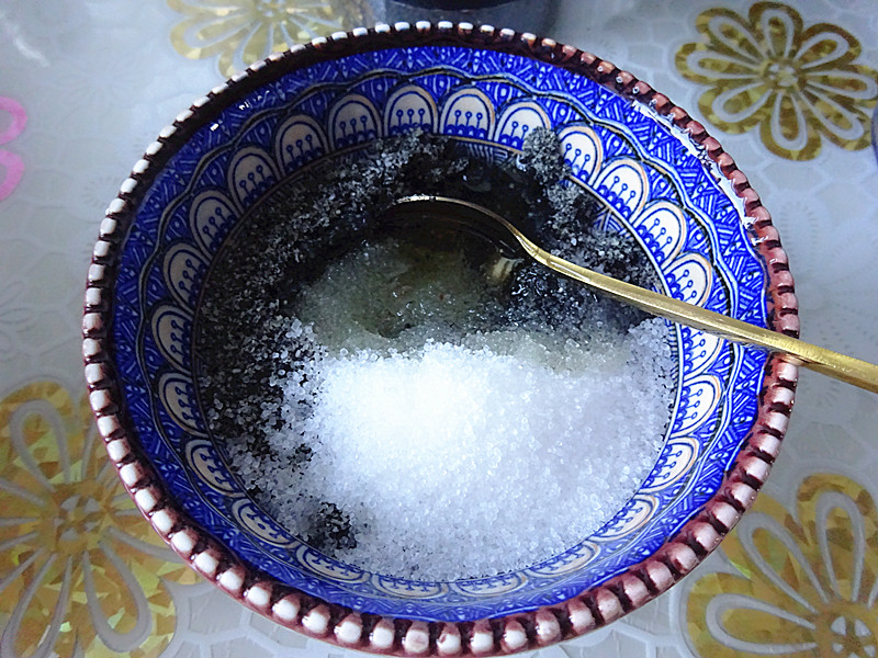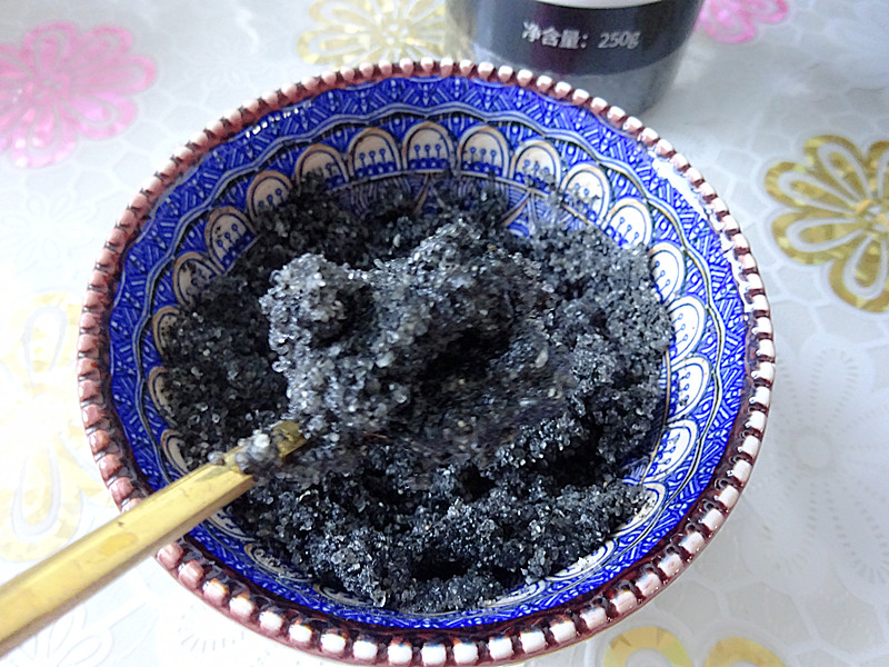 根据自己的口味把控糖量,放入植物油,油要一勺勺的放,一边拌一边放,因为黑芝麻不吃油,放多了会稀就不好了。